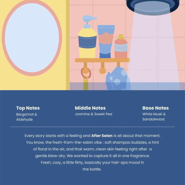 Every story starts with a feeling and After Salon is all about that moment. You know, the fresh -from-the-salon vibe : soft shampoo bubbles, a hint of floral in the air, and that warm, clean skin feeling right after a gentle blow-dry. We wanted to capture it all in one fragrance. Fresh, cozy, a little flirty, basically your hair-spa mood in the bottle. Fragrance Notes: