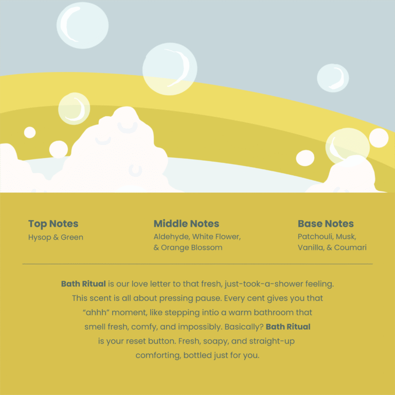 Bath Ritual is our love letter to that fresh, just-took-a-shower feeling. This scent is all about pressing pause. Every scent gives you that "ahh" moment, like stepping into a warm bathroom that smell fresh, comfy, and impossibly. Basically? Bath Ritual is your reset button. Fresh, soapy, and straight-up comforting, bottled just for you.   Fragrance Notes: